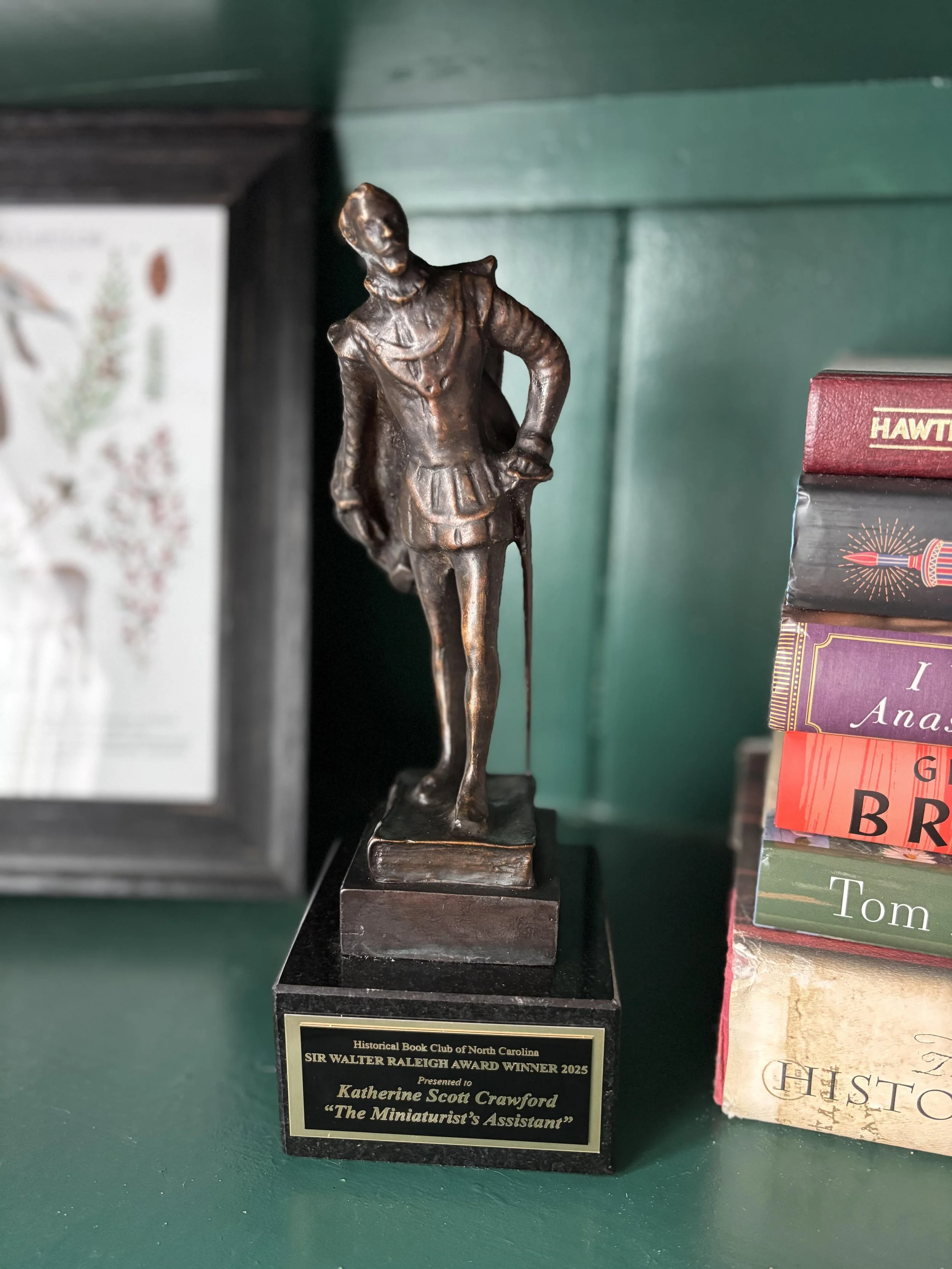 Well, the official bronze—and very heavy—statue of Sir Walter Raleigh is in my house and on my built-in bookshelf. I am thrilled! As you might remember, back in December, The Miniaturist’s Assistant was awarded a 2025 North Carolina Book Award: the Sir Walter Raleigh Award, the state’s highest honor for fiction. (I’m still glowing.)